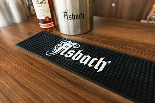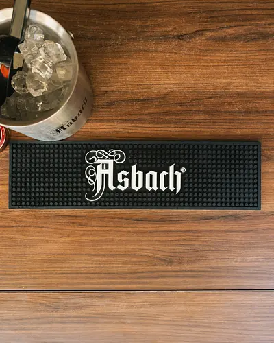 Ob an der Bar oder bei der Party zuhause, die schwarze Asbach Barmatte mit weißem Logo sorgt dafür, dass dein Glas Asbach-Cola immer stilvoll bereitsteht.